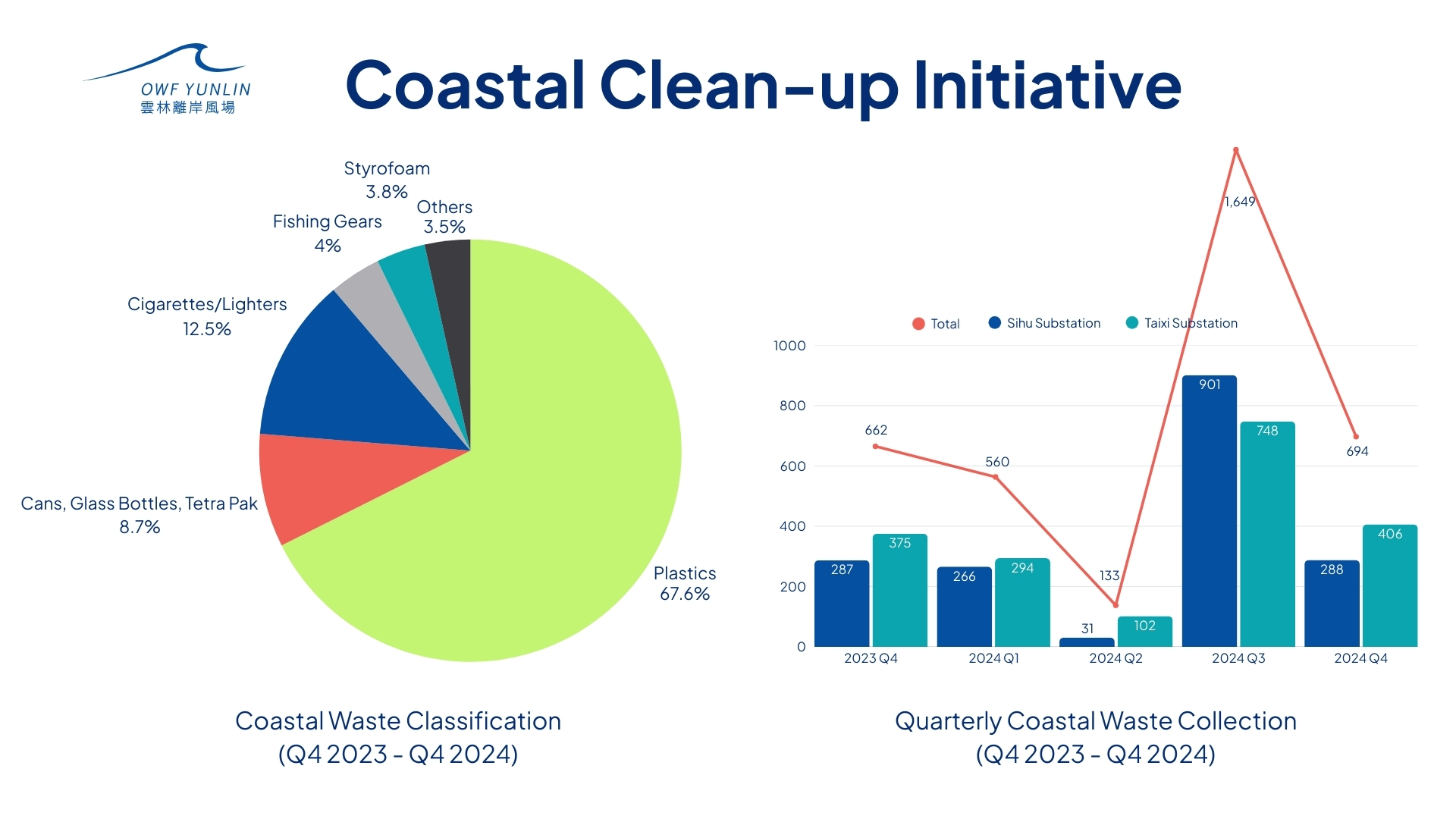 In December 2023, and as part of the Environmental Management Plan, YWPC has established the quarterly Coastal Clean-up Initiative, which will also remain actively implemented during the Operations & Maintenance (O&M) phase. In collaboration with the National Taiwan Ocean University (NTOU) and local communities, coastal clean-ups have been conducted quarterly in the vicinity and around the substations in Taixi and Sihu. The teams hereby utilise International Coastal Clean-up (ICC) data forms to meticulously document the types and quantities of collected waste.