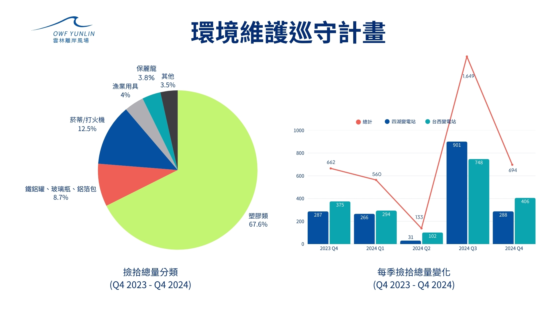 根據統計資料,淨灘行動共清理出3,698件廢棄物,其中約70%為塑膠類。值得注意的是,2024年第3季受颱風季影響,廢棄物數量顯著上升;然而,在非颱風季期間,海岸廢棄物明顯減少,顯示定期淨灘行動對減緩廢棄物累積有正面成效。